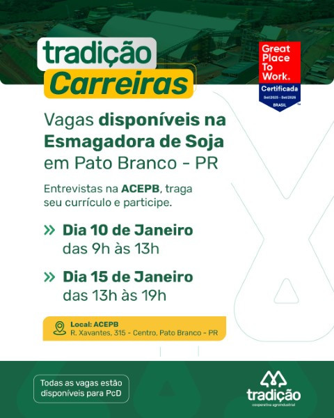 A Cooperativa Agroindustrial Tradição realiza, nos dias 10 e 15 de janeiro, uma grande ação de captação de profissionais para atuar na Indústria de Óleo e Farelo de Soja, em Pato Branco. A iniciativa faz parte do processo de estruturação do Novo Complexo Industrial da cooperativa e busca completar o quadro de colaboradores para o início das operações, previsto para o mês de abril.