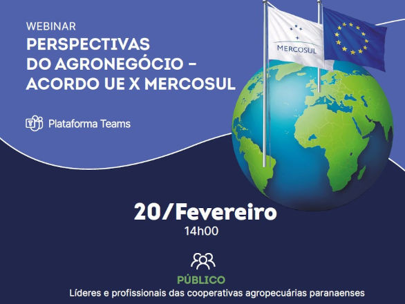 O Sistema Ocepar promove, nesta sexta-feira (20/02), das 14 às 16 horas, o webinar Perspectivas do Agronegócio – Acordo União Europeia Mercosul. O evento será transmitido pela plataforma Microsoft Teams.