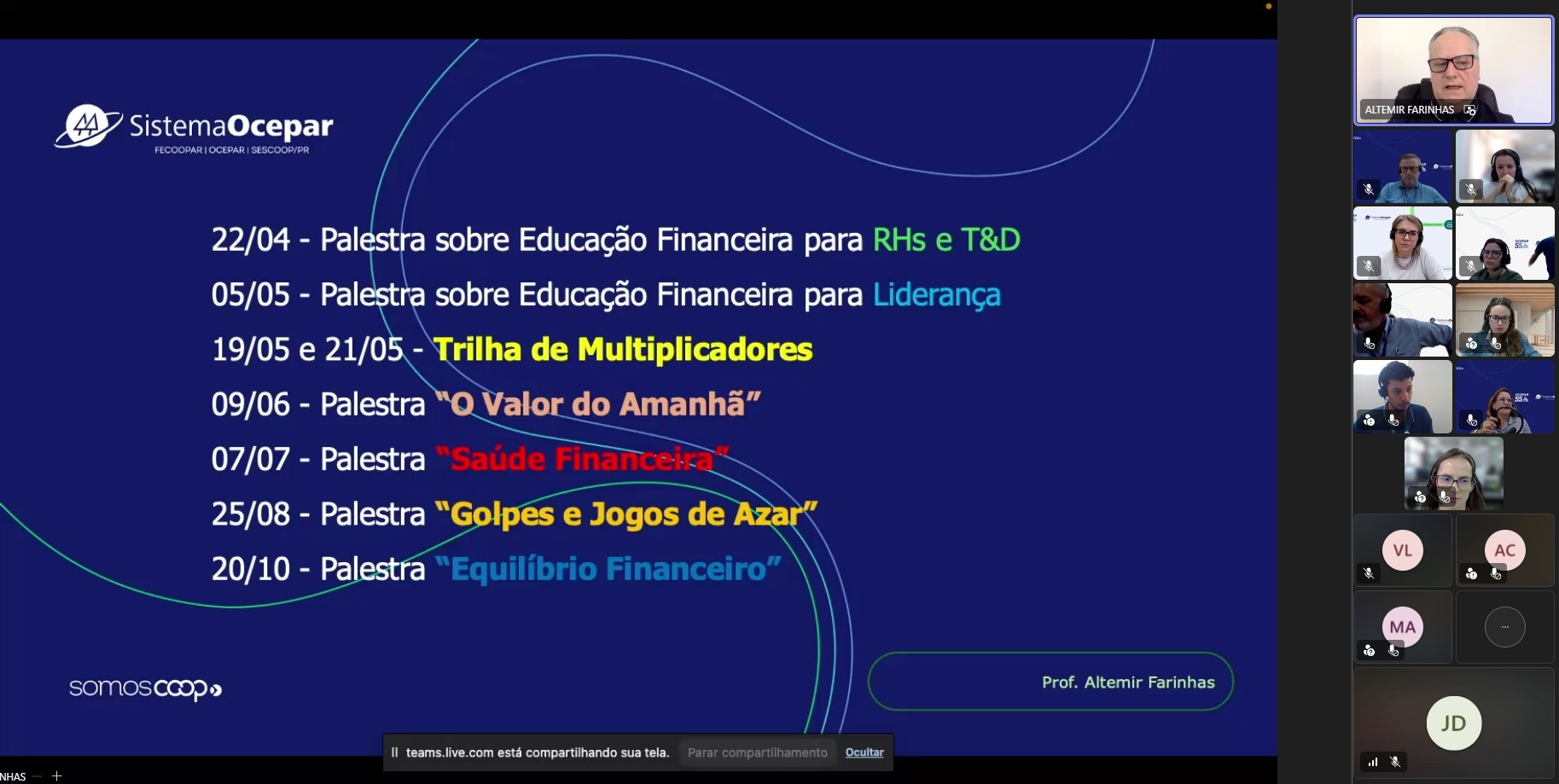 A programação desta edição do programa de educação financeira, que teve início nessa quarta-feira (22/04), prossegue até outubro. O conteúdo será disponibilizado por meio de palestras e trilhas de multiplicadores. As palestras terão como temas: “Educação Financeira”, “Valor do Amanhã”, Saúde Financeira”, Golpes e Jogos de Azar” e “Equilíbrio Financeiro”. A trilha de multiplicadores, que será realizada de 19 a 21 de maio, envolverá voluntários das cooperativas que manifestarem interesse. Os interessados passarão por uma seleção por meio das áreas de recursos humanos das cooperativas para avaliar a aptidão. A partir daí, receberão treinamento.