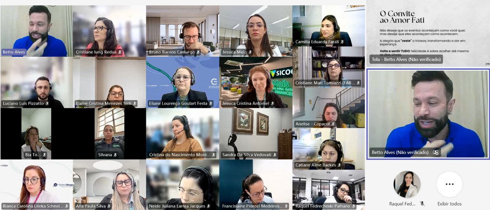 Mais de 130 representantes de cooperativas se reuniram de forma online, na manhã desta quarta-feira (19), para assistir à palestra do psicanalista clínico Betto Alves, “FIC – A Felicidade é contagiosa”, oferecida pelo programa Felicidade Interna Cooperativa (FIC), do Sistema Ocepar, por meio do Sescoop/PR.