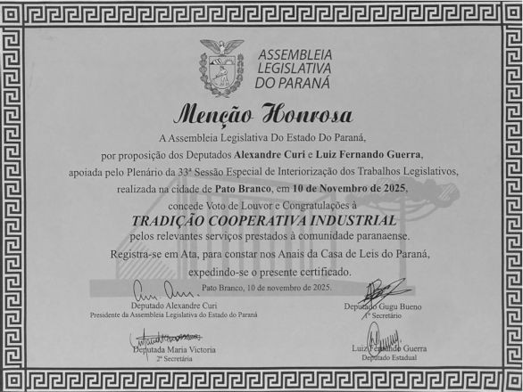 A Cooperativa Agroindustrial Tradição foi homenageada pela Assembleia Legislativa do Paraná com uma Menção Honrosa em reconhecimento à sua trajetória e contribuição para o desenvolvimento do agronegócio paranaense.