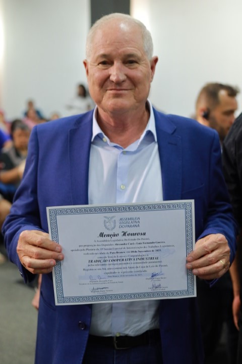 A indicação partiu do deputado estadual pato-branquense Luiz Fernando Guerra, e a entrega ocorreu durante a sessão itinerante da Casa de Leis, realizada na 19ª Expopato, em Pato Branco. O presidente Julinho Tonus, recebeu a homenagem em nome da cooperativa.
