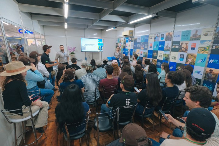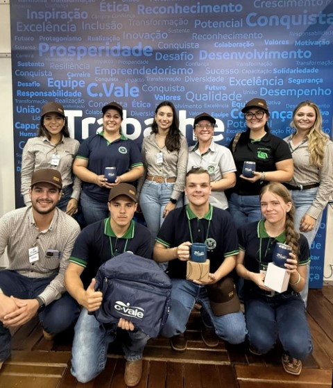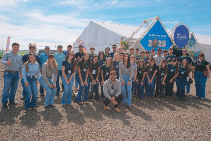 Durante o Dia de Campo 2025 da C.Vale, edição de primavera, a equipe do Departamento de Recursos Humanos realizou tour técnico com acadêmicos de cinco instituições de ensino. A equipe de recrutamento da cooperativa apresentou os espaços do campo experimental a mais de 200 estudantes de cursos da área agrária, durante os três dias do evento.