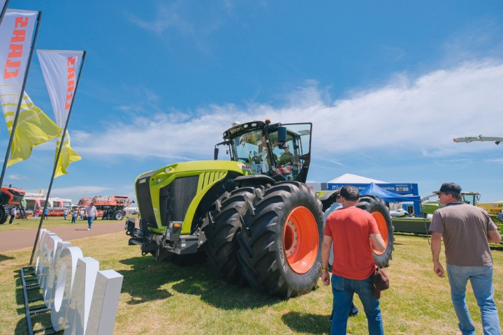 Ainda na área de máquinas, uma das atrações é um trator Claas, modelo Xeron 5000. Com 530 cv e oito pneus, ele é indicado para grandes áreas e impressiona pelo tamanho e pela cabine com monitores e comandos eletrônicos.