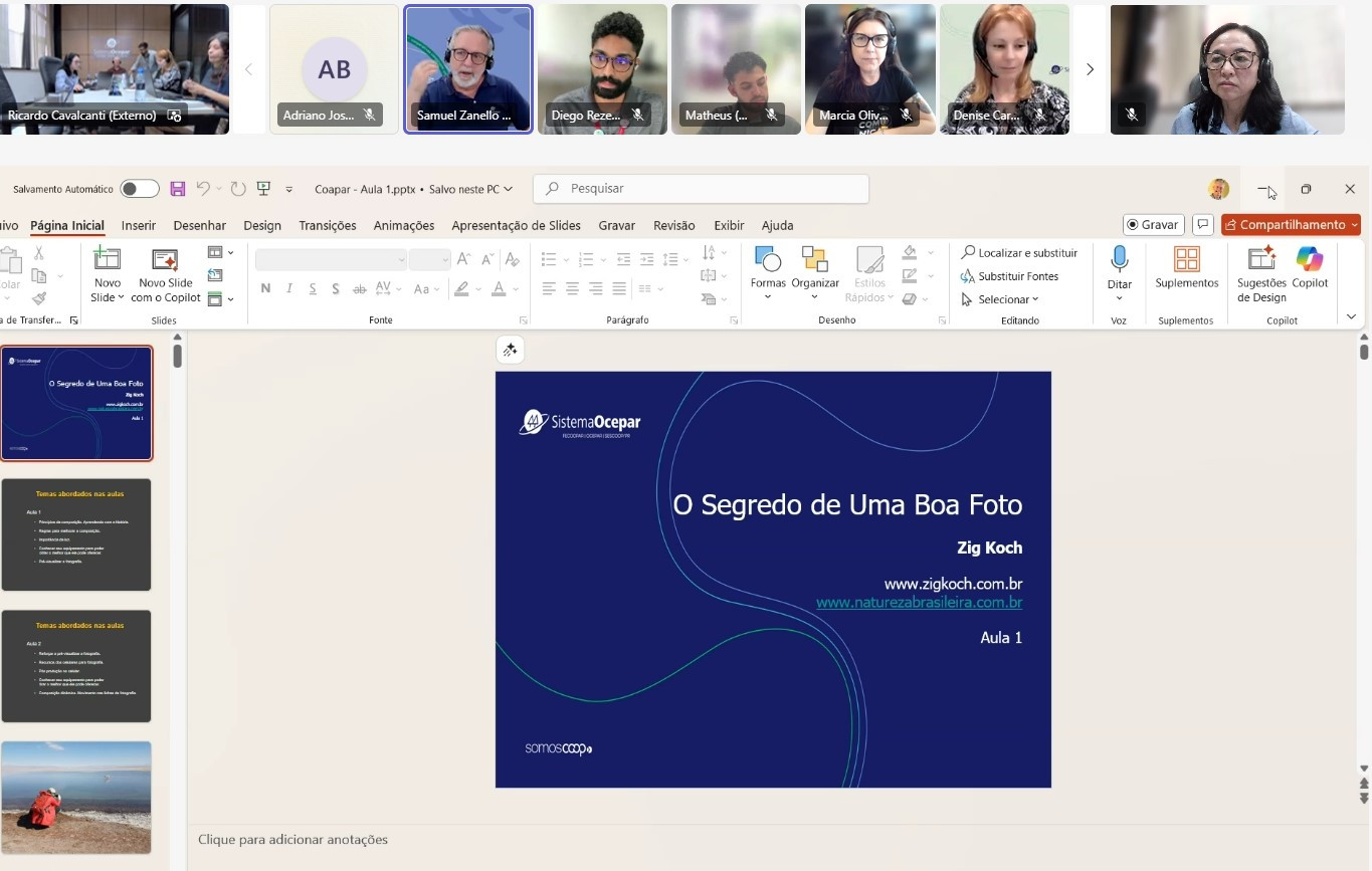 Trinta profissionais que atuam nas áreas de Comunicação e Marketing das cooperativas do Paraná iniciaram, na tarde dessa segunda-feira (01/12), uma imersão em fotografia organizada pelo Sistema Ocepar, com apoio da Cooperativa Paranaense de Turismo (Cooptur). O instrutor é o fotógrafo Zig Koch. A programação se estende até quinta-feira (04/12). Os dois primeiros dias estão sendo dedicados às orientações teóricas, em encontros online com duração de duas horas cada. As atividades foram abertas pelo coordenador de Comunicação e Marketing do Sistema Ocepar, Samuel Milléo Filho.