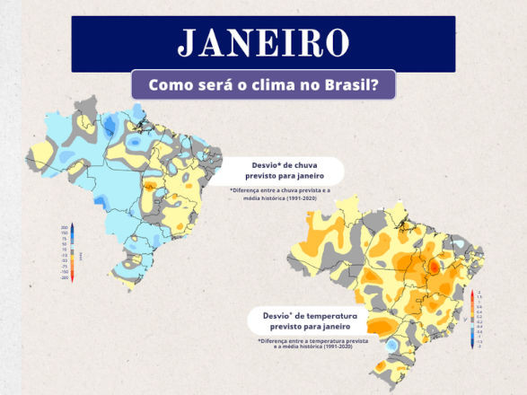 A previsão climática do Instituto Nacional de Meteorologia (Inmet) indica irregularidade na distribuição das chuvas sobre o território brasileiro no mês de janeiro de 2026. São previstos volumes de chuva acima da média.