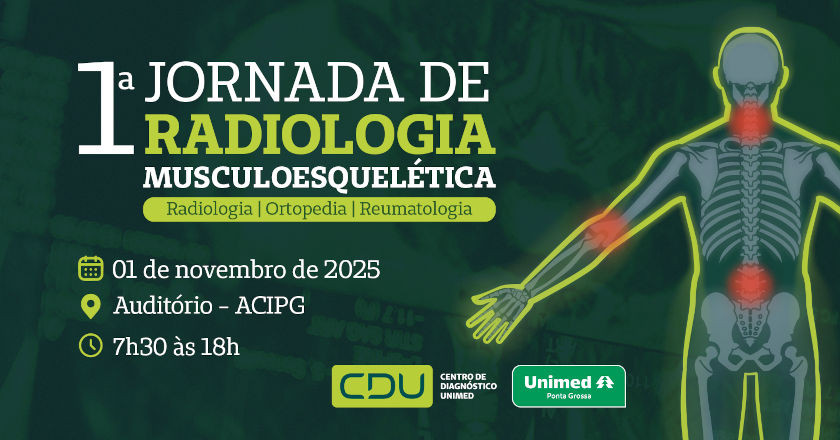 A Unimed Ponta Grossa realiza, neste sábado (01/11), a 1ª Jornada de Radiologia Musculoesquelética. O evento acontece no auditório da ACIPG, em Ponta Grossa (PR), das 7h30 às 18h, com uma programação intensa voltada à atualização científica.