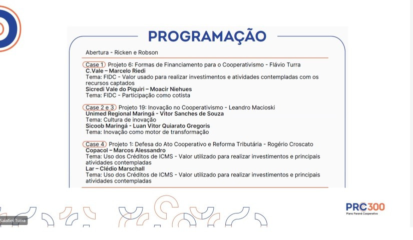 O analista de desenvolvimento técnico da Ocepar, Salatiel Turra, explicou que o encontro foi pensado para apresentação de cases de sucesso de cooperativas. Seis representantes foram convidados para contar detalhes de atividades desenvolvidas dentro de projetos do PRC300 nas áreas de formas de financiamentos para o cooperativismo, inovação e defesa do Ato Cooperativo e Reforma Tributária.
