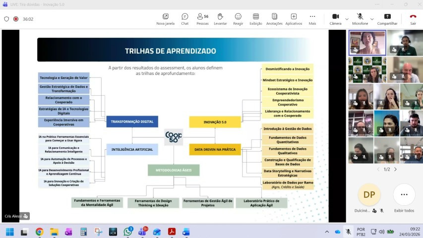 O Sescoop/PR apresentou, em live realizada na manhã dessa quarta-feira (25/03), a nova edição do Programa Coop 5.0, desenvolvido em parceria com a Universidade Federal do Paraná (UFPR). O encontro reuniu agentes de Desenvolvimento Humano, equipes de RH, T&D e agentes de inovação das cooperativas paranaenses.