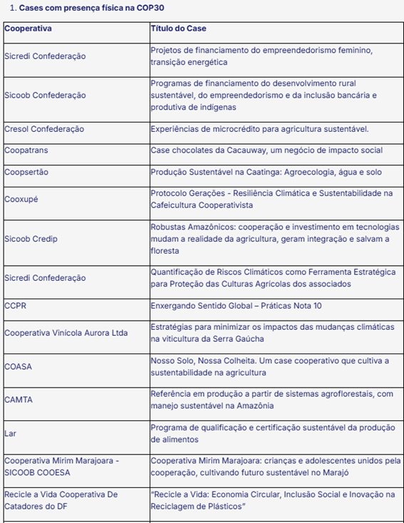A lista de cooperativas que representarão o cooperativismo brasileiro na COP30 contempla os ramos do cooperativismo, com projetos que envolvem desde produção agropecuária de baixo carbono, energia renovável e eficiência energética, até finanças verdes, bioeconomia e recuperação de áreas degradadas. “Nosso papel é mostrar ao mundo que o cooperativismo brasileiro já entrega soluções concretas para a transição climática justa”, destacou Tania Zanella, superintendente do Sistema OCB.