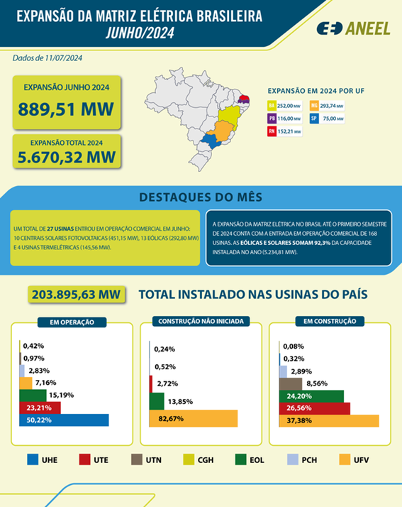O mês de junho respondeu por um aumento de 889,51 megawatts (MW) e a entrada em operação de 27 usinas, sendo 13 eólicas, 10 fotovoltaicas e 4 termelétricas.