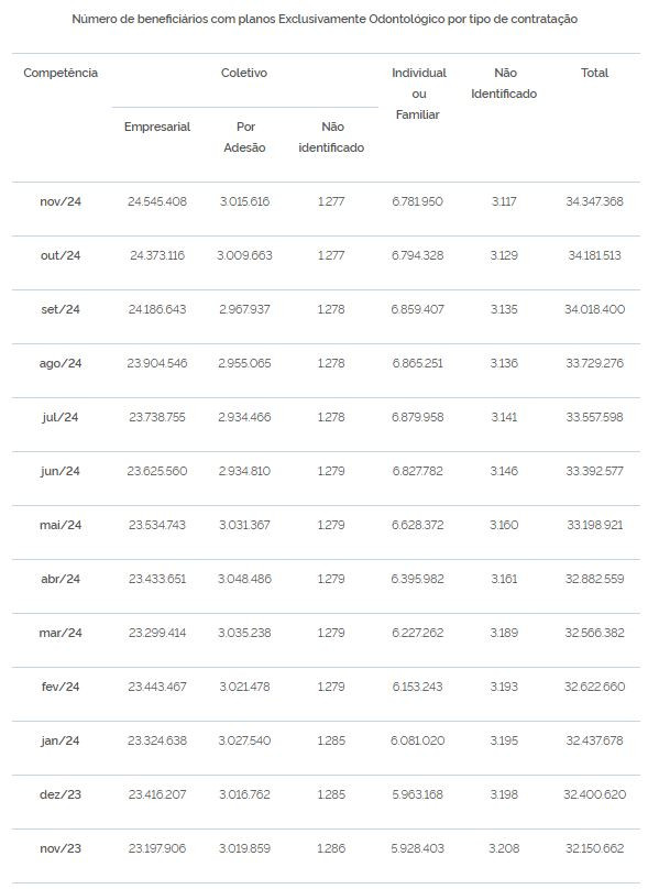 A Agência Nacional de Saúde Suplementar (ANS) disponibilizou em seu portal os números de beneficiários de planos de saúde referentes a novembro de 2024. Neste período, o setor registrou 51.508.727 de usuários em assistência médica e 34.347.368 em planos exclusivamente odontológicos. Esses e outros dados estão disponíveis na Sala de Situação.
