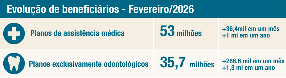 Os números mostram que, nos planos médico-hospitalares, fevereiro teve um crescimento de 36.410 beneficiários em relação ao mês anterior (variação de 0,07%). Comparando com o mesmo mês em 2025, houve aumento de 1.028.835 beneficiários no setor (crescimento de 1,98%).