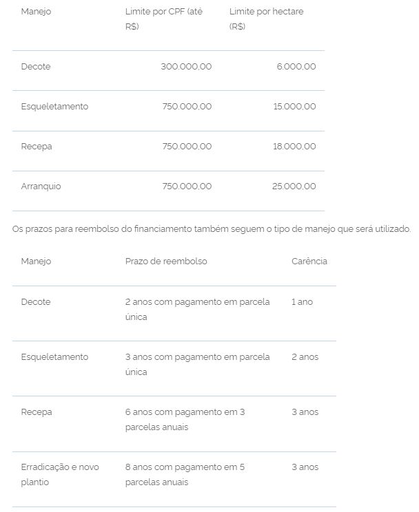 Limites - Os limites de crédito variam de acordo com o manejo a ser aplicado na lavoura. Decote, esqueletamento, recepa e arranquio são práticas culturais aplicadas no café, quando ocorre uma injuria na planta (climática, ataque de pragas, envelhecimento da planta, etc). (Mapa)