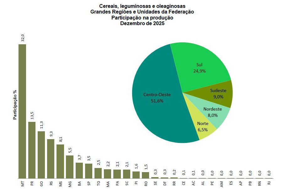 Segundo o IBGE, o Paraná deve ter aumento de 1,5% na produção em 2026. Outros estados que devem ter bom desempenho no setor são no Rio Grande do Sul, Piauí e Rondônia. Na contramão, o IBGE aponta declínios no Mato Grosso (-7,9%), em Goiás (-8,0%), no Mato Grosso do Sul (-6,8%), em Minas Gerais (-1,7%), na Bahia (-4,7%), em São Paulo (-4,8%), no Tocantins (-2,9%), no Maranhão (-0,7%), no Pará (-8,6%), em Santa Catarina (-1,6%) e em Sergipe (-7,4%).