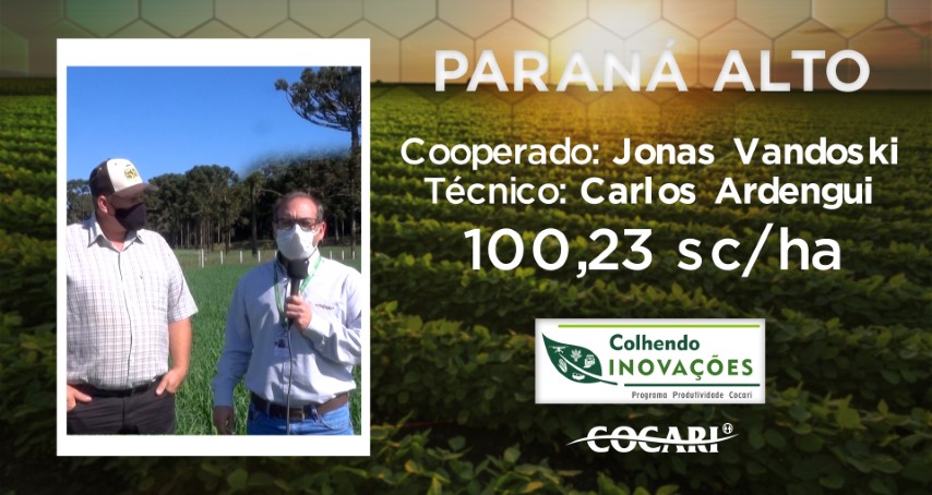 Paraná Alto e Campos Gerais – Jonas Vandoski, cooperado de Ponta Grossa-PR, e o técnico Carlos Ardengui foram os campeões na categoria Paraná Alto e Campos Gerais, com 100,23 sc/ha. “Agradeço a Deus pelo clima ter corrido bem para alcançarmos essa marca porque por mais que o produtor consiga investir na planta, se não tiver chuva na hora certa, sol no momento exato, o bom acompanhamento do engenheiro agrônomo, de nada adianta. Ficar em primeiro lugar nesta categoria foi uma surpresa. Eu esperava colher bem, mas não tanto assim. Fiquei satisfeito porque foi resultado de um trabalho em conjunto”, frisou o cooperado.