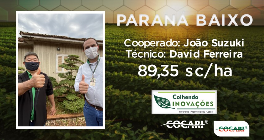 Paraná Baixo – Ao lado do técnico David Ferreira da Silva Junior, o cooperado João Suzuki, de Borrazópolis-PR, alcançou a melhor marca na categoria Paraná Baixo, com produtividade de 89,35 sc/ha. “É uma grande satisfação participar do Programa Colhendo Inovações. Agradeço a Deus por ter colhido esta safra porque foi um ano muito desafiador, em que tivemos uma grande estiagem na fase inicial e depois chuva na formação dos grânulos, além de vários dias nublados. Com isso, não conseguimos fechar a produtividade esperada, mas, graças a Deus, ainda conseguimos essa produtividade. Agradeço à Cocari e ao Detec pelo trabalho em parceria com o uso de tecnologias”, destacou o produtor.