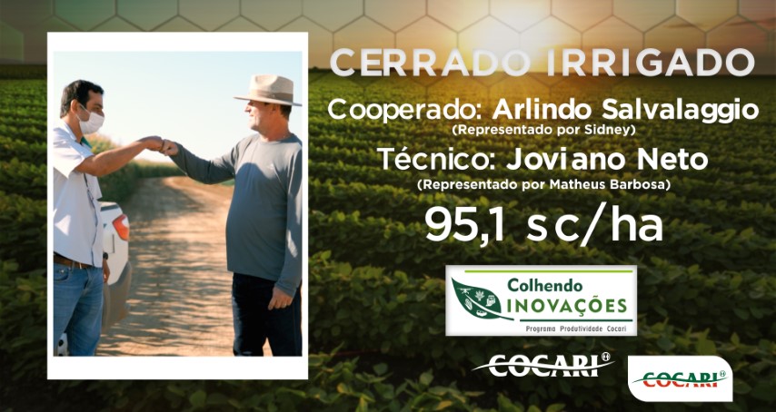 Cerrado Irrigado – De Campo Alegre de Goiás-GO, o produtor Arlindo Salvalaggio e o técnico Joviano José da Silva Neto alcançaram o primeiro lugar na categoria Cerrado Irrigado, com 95,1 sc/ha. “É a segunda vez que participamos do Colhendo Inovações e essa parceria com a Cocari foi muito boa, o técnico sempre esteve à disposição para esclarecer alguma dúvida e orientar na hora das aplicações de defensivos, fungicidas. Nosso maior desafio nesta edição foi em relação ao clima, que estava muito instável, mas com as orientações dos técnicos, trocando ideias constantemente, conseguimos chegar a um fator satisfatório”, disse Sidney Luís Salvalaggio, filho do cooperado Arlindo Salvalaggio.