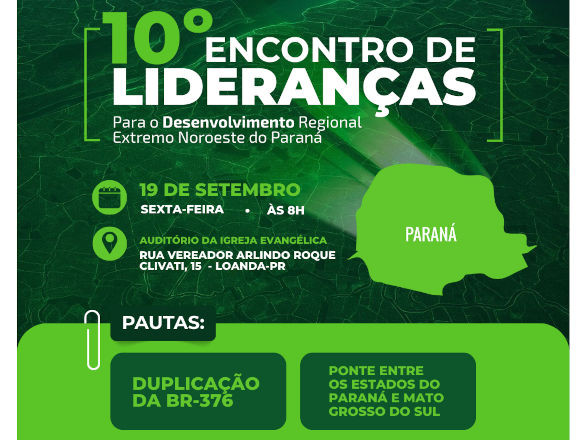 A União das Entidades do Extremo Noroeste Paranaense (Uenor) realiza, no dia 19 de setembro, a partir das 8h, o 10º Encontro de Lideranças, no auditório da Igreja Evangélica de Loanda (PR), com apoio do Sicredi Rio Paraná.