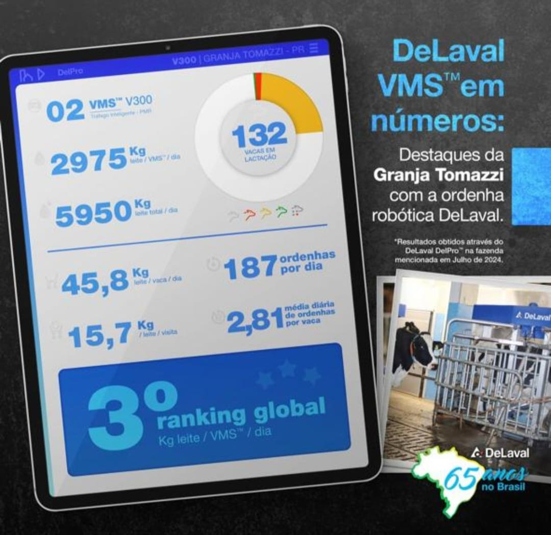 Geraldo já havia se destacado em rankings anteriores da DeLaval, ocupando a quinta posição no Brasil em 2022 e a sétima em 2023. Mas em julho de 2024, a propriedade dele figurou entre as dez melhores do mundo (terceiro melhor desempenho em ranking global da multinacional), um feito incrível considerando que, no Brasil, mais de 400 propriedades utilizam robôs na produção de leite, enquanto que no mundo são mais de 50 mil.