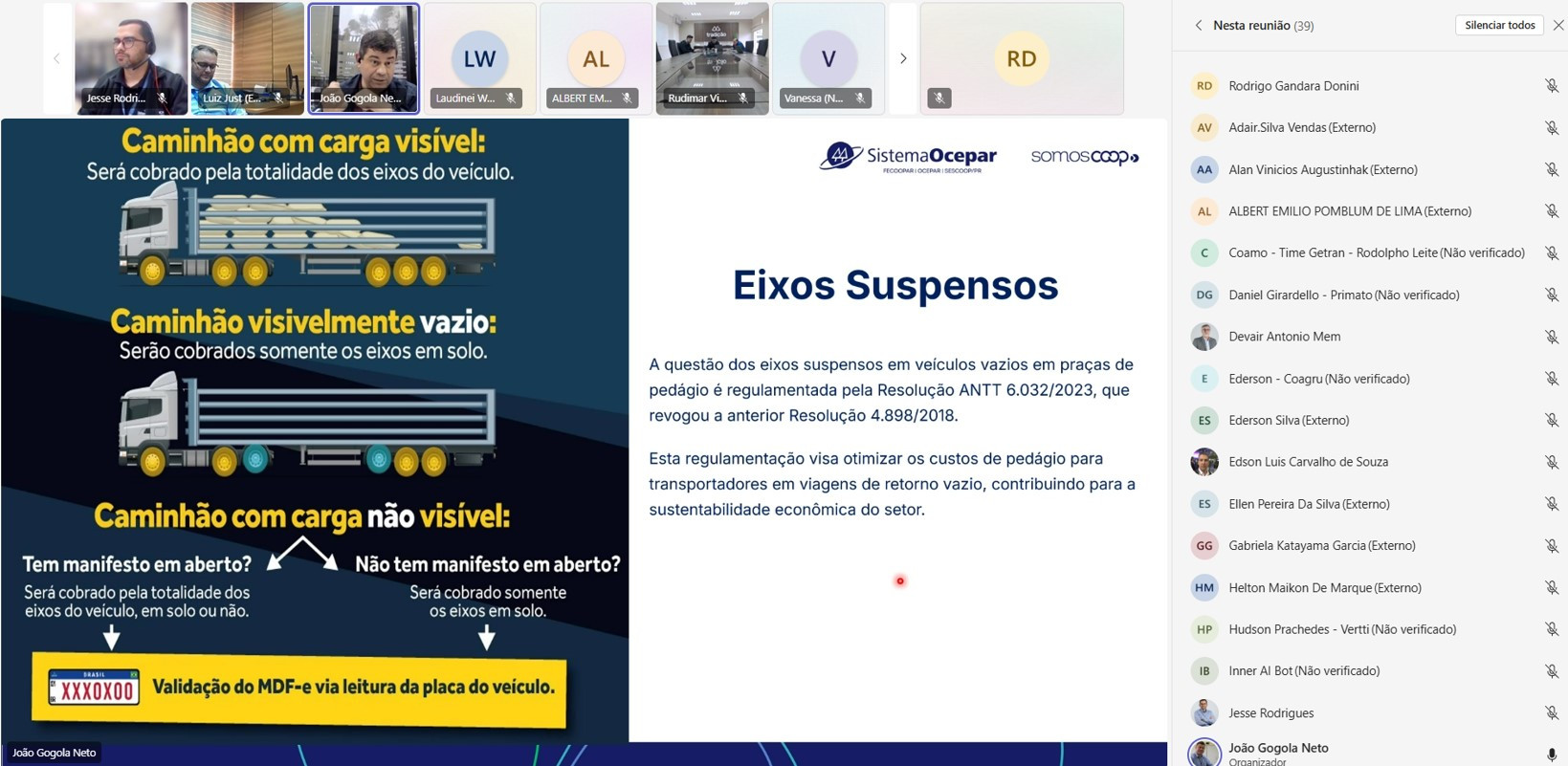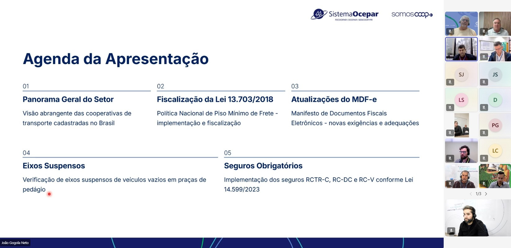 Na última sexta-feira (03/10), o Sistema Ocepar promoveu uma reunião on-line com mais de 40 representantes de cooperativas agropecuárias para esclarecer as novas exigências e suas implicações diretas nas operações logísticas do setor. A abertura foi conduzida pelo superintendente da Ocepar, Robson Mafioletti, e a apresentação técnica foi ministrada por João Gogola Neto, gerente de Monitoramento e Consultoria do Sescoop/PR, que detalhou o escopo da medida, os riscos operacionais e os ajustes necessários para evitar autuações.