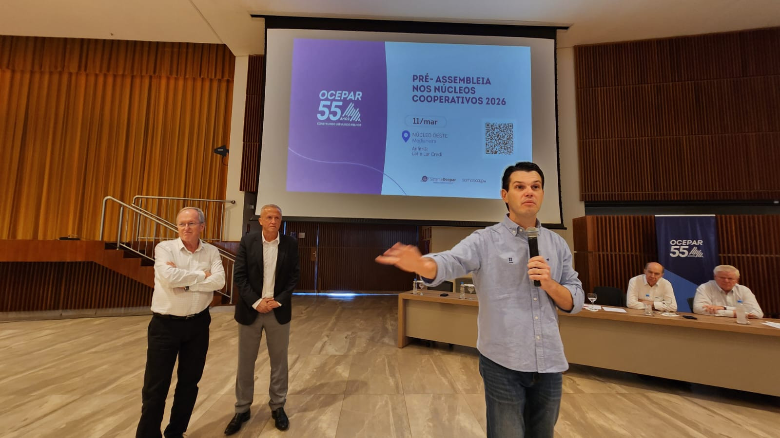 Na manhã desta quarta-feira (11/03), o Lar Centro de Eventos, em Medianeira, sediou a terceira das quatro reuniões pré-assembleia do Sistema Ocepar, que ocorrem durante os Encontros de Núcleos Cooperativos, com lideranças da região Oeste. Na oportunidade, o presidente da Copel, Daniel Slaviero, lançou oficialmente o Programa Copel Agro. Ele estava acompanhado do diretor geral, Marco Antônio Villela de Abreu, e do diretor de Comunicação, David Campos.