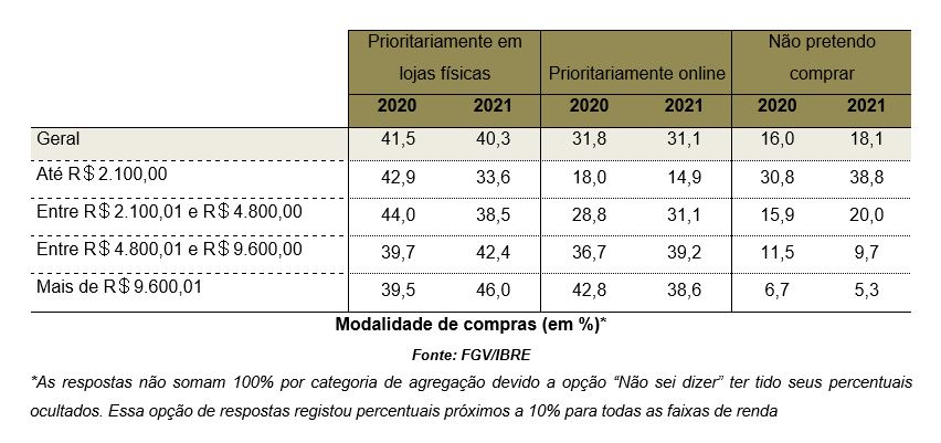 As compras de Natal este ano devem ser melhores que em 2020 (de 40,7 para 60,1 pontos), porém ainda com desempenho pior que nos anos anteriores, segundo indica estudo do Instituto Brasileiro de Economia da Fundação Getulio Vargas (FGV IBRE). A pesquisa analisa a intenção de compra dos consumidores, quanto pretendem gastar com os presentes da ocasião e como devem comprar. O dado que chamou a atenção em 2021 foi a desigualdade entre as famílias de menor e maior pode aquisitivo -- a diferença de intenção de compras das que ganham até R$ 4.800,00 e as que ganham acima desse valor atingiu 44,4 pontos, o maior resultado da série histórica.