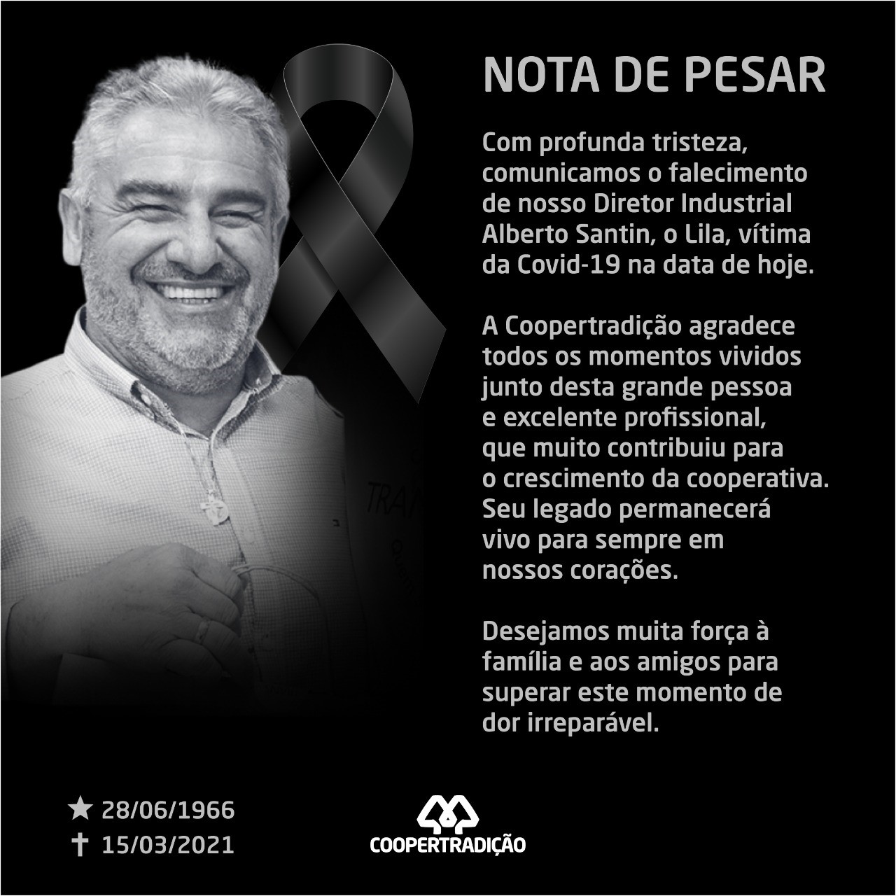 A Coopertradição, sediada em Pato Branco, no Sudoeste do Paraná, emitiu uma nota de pesar, comunicando o falecimento, nesta segunda-feira (15/03), do diretor industrial da cooperativa, Alberto Santin, mais conhecido como Lila, em consequência da Covid-19. “A Coopertradição agradece todos os momentos vividos junto dessa grande pessoa e excelente profissional, que muito contribuiu com o crescimento da cooperativa. O seu legado permanecerá vivo para sempre em nossos corações. Desejamos muita força à família e aos amigos para superar este momento de dor irreparável”, afirma a direção da Coopertradição.
